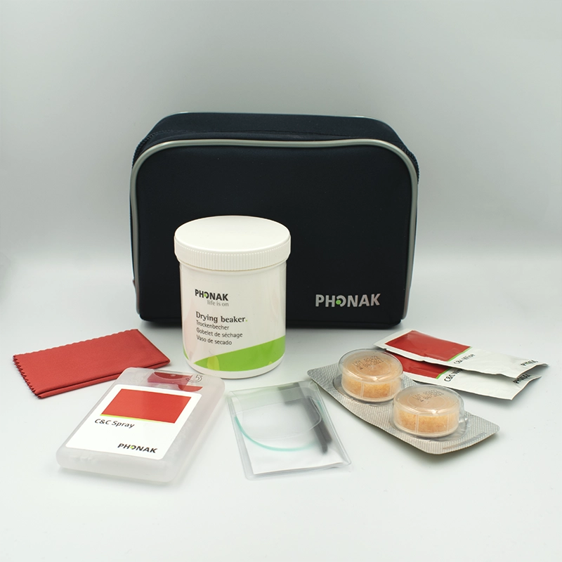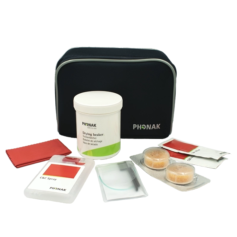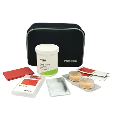 Denne hygienje kasse indeholder: Phonak hygiejne taske med 1 stk. DryCup med si, 2 stk. Tøretabletter, 2 stk. Rensebørster, 10 stk. disinficerende servietter, 1 stk. 18 ml. disinficerende spray, 1 stk. mikrofiber serviet.