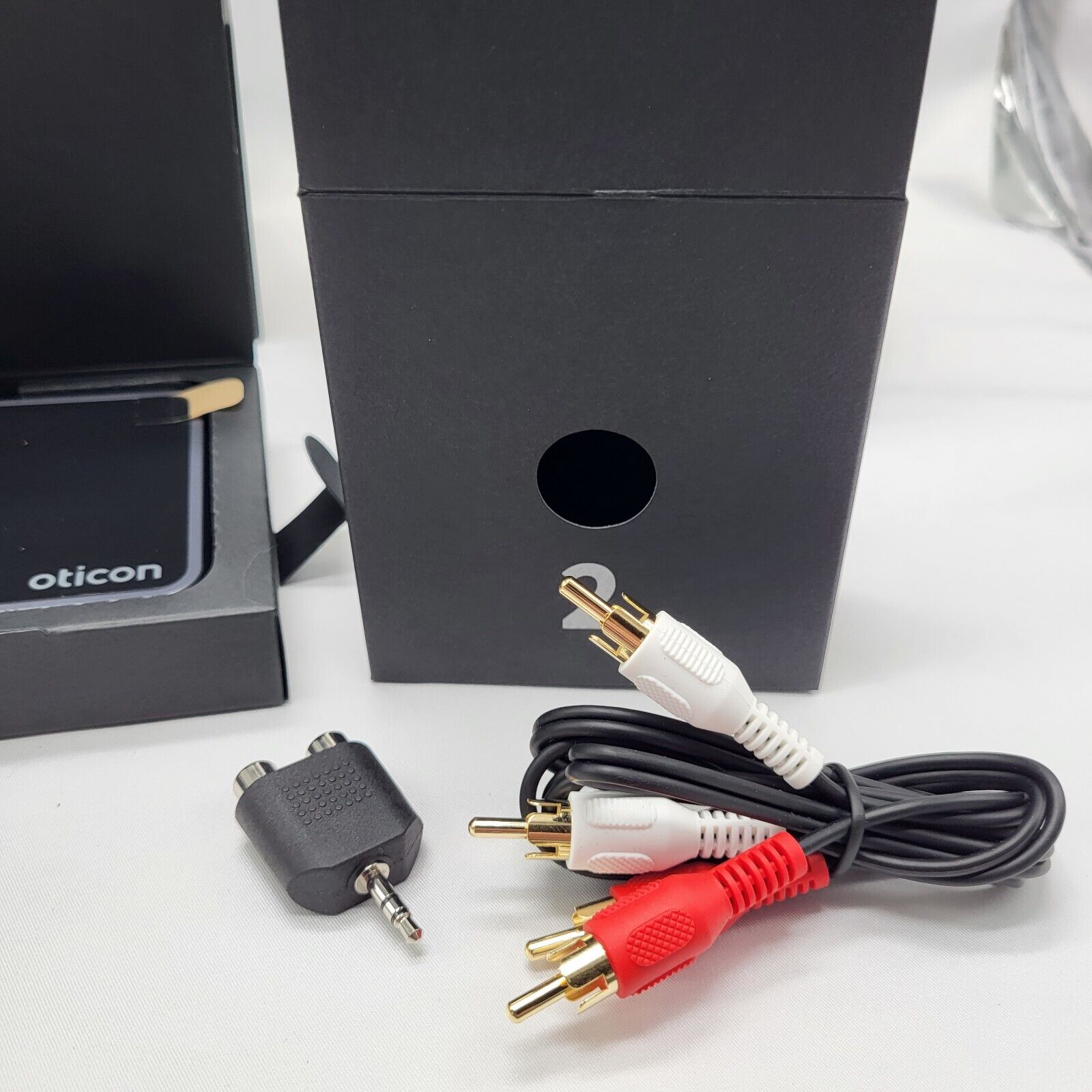 Oticon kabelsæt til TV-adapter, som findes i den originale æske 2, indeholder et RCA-kabel og en minijack-adapter. Selvom Oticon anbefaler brug af TOSLINK-kabel for den bedste lydoplevelse, giver dette kit fleksible tilslutningsmuligheder for din TV-adapter. RCA-kablet tilsluttes TV’ets “L-R AUDIO OUT” porte, mens minijack-adapteren giver mulighed for tilslutning via hovedtelefonstikket. Ideel for dem, der har brug for alternative tilslutningsmetoder.