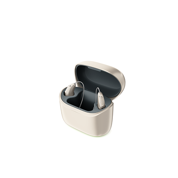 Opladeren er meget nem at bruge og du behøver ikke at bekymre dig om at tænde eller slukke for dine høreapparater. Du skal bare indsætte dine Audéo Lumity høreapparater i deres respektive ladeåbninger, og de slukker af sig selv. Når du fjerner dem fra opladeren, tændes de også automatisk.