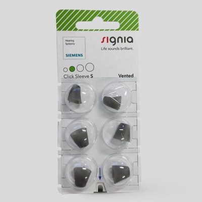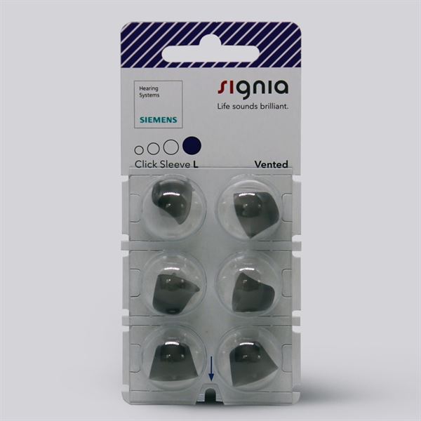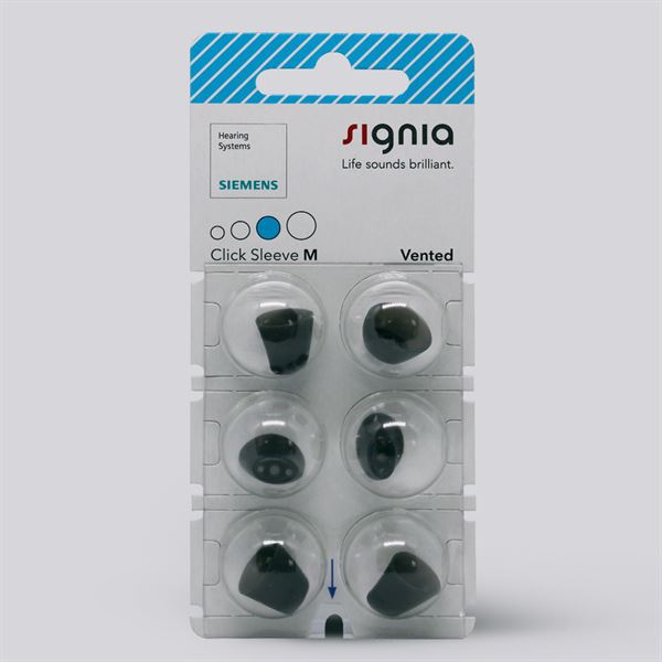 Signia Click Sleeves er domes til høreapparater, som kan bruges til flere af Signias høreapparater, såsom Signia Silk samt almindelige Reciever i øret høreapparater. Ved Signias små Silk høreapparater, som er næsten usynlige inde i øret, sættes domen på høreapparatet og sikrer en perfekt pasform til øregangen. Endvidere gør anti-slip effekten, at høreapparaterne bliver inde i øret hele tiden. Der kan vælges mellem flere versioner af Signia Click Sleeves, hvor der findes både en åben og ventileret version.