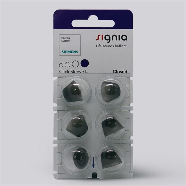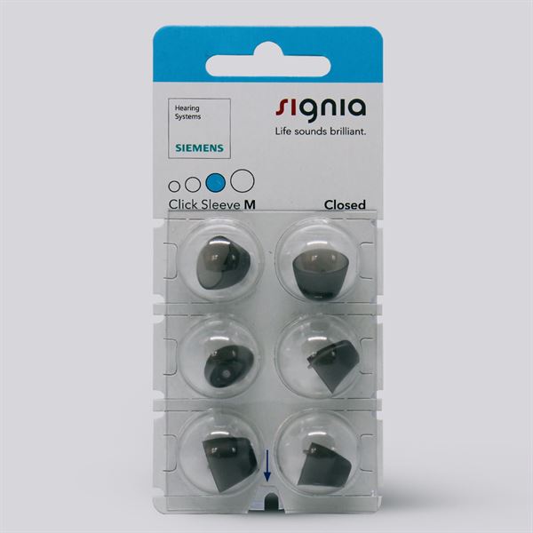 Signia Click Sleeves er domes til høreapparater, som kan bruges til flere af Signias høreapparater, såsom Signia Silk samt almindelige Reciever i øret høreapparater. Ved Signias små Silk høreapparater, som er næsten usynlige inde i øret, sættes domen på høreapparatet og sikrer en perfekt pasform til øregangen. Endvidere gør anti-slip effekten, at høreapparaterne bliver inde i øret hele tiden. Der kan vælges mellem flere versioner af Signia Click Sleeves, hvor der findes både en åben og ventileret version.