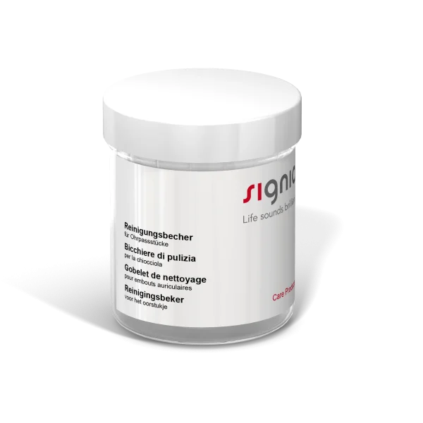 Begynd med at placere en Signia rengøringstablet i koppen og fyld den derefter to tredjedele op med varmt vand. Tilsæt derefter ørepropperne i koppen og lad dem ligge i blød i 30 minutter. Fjern derefter ørepropperne forsigtigt og skyl dem grundigt med lunkent vand.